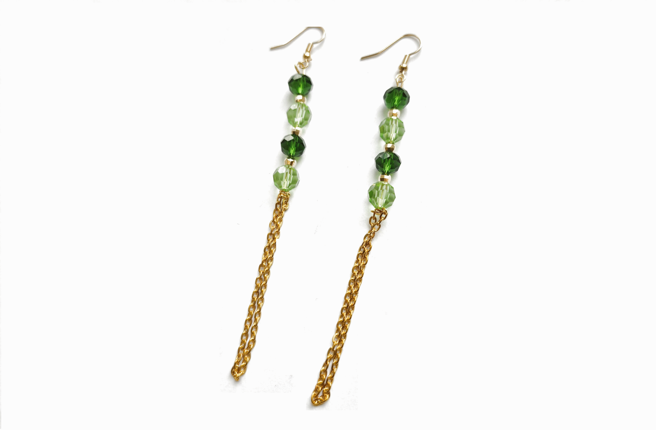 This product contains 4 green crystal beads interspersed with gold metal beads, and finished with a double chain flourish at its base.