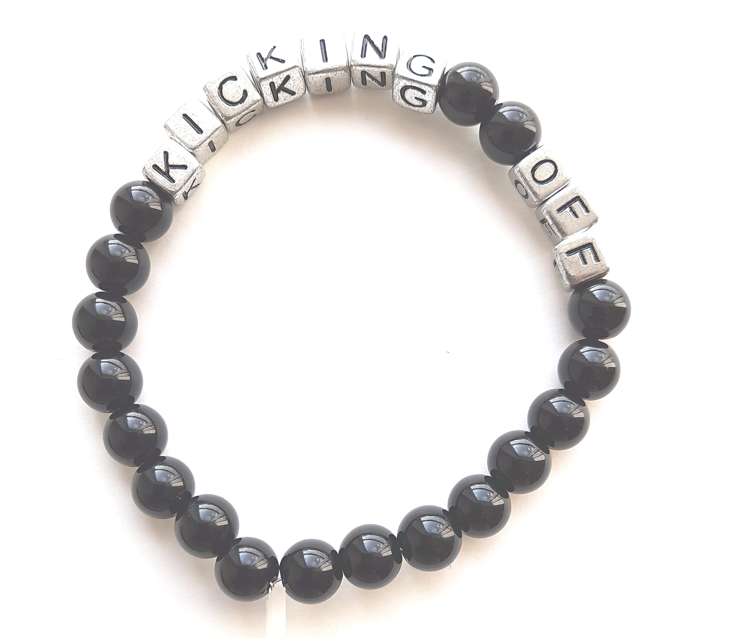 Beaded bracelet with 8mm sized beads.  Message – is “KICKING OFF”