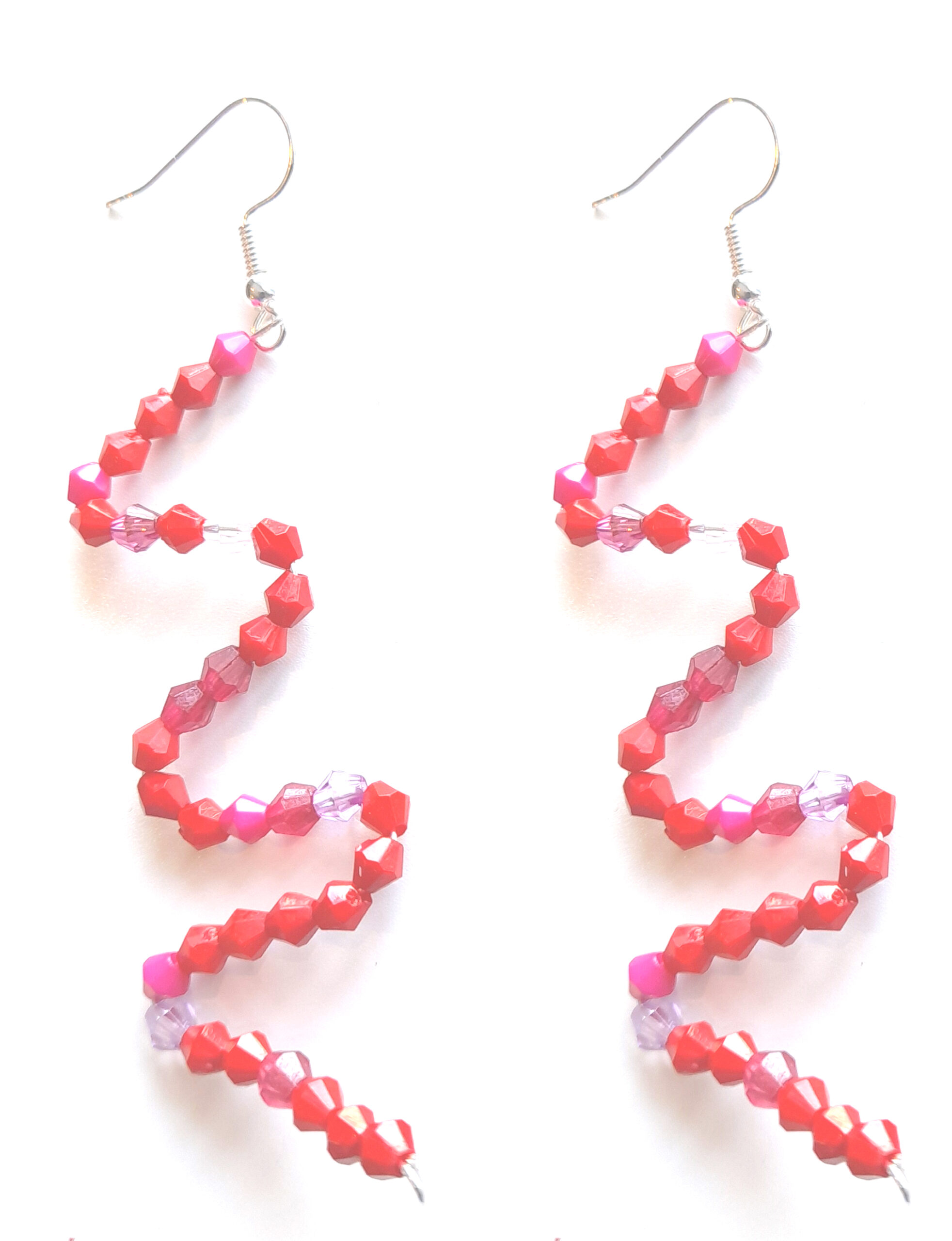 Red zig zag style earring which will make you stand out in a crowd. The red beads are interspersed with clear red crystals for added light reflection. Available with silver plated earring wire, or we provide a premium version in sterling silver.