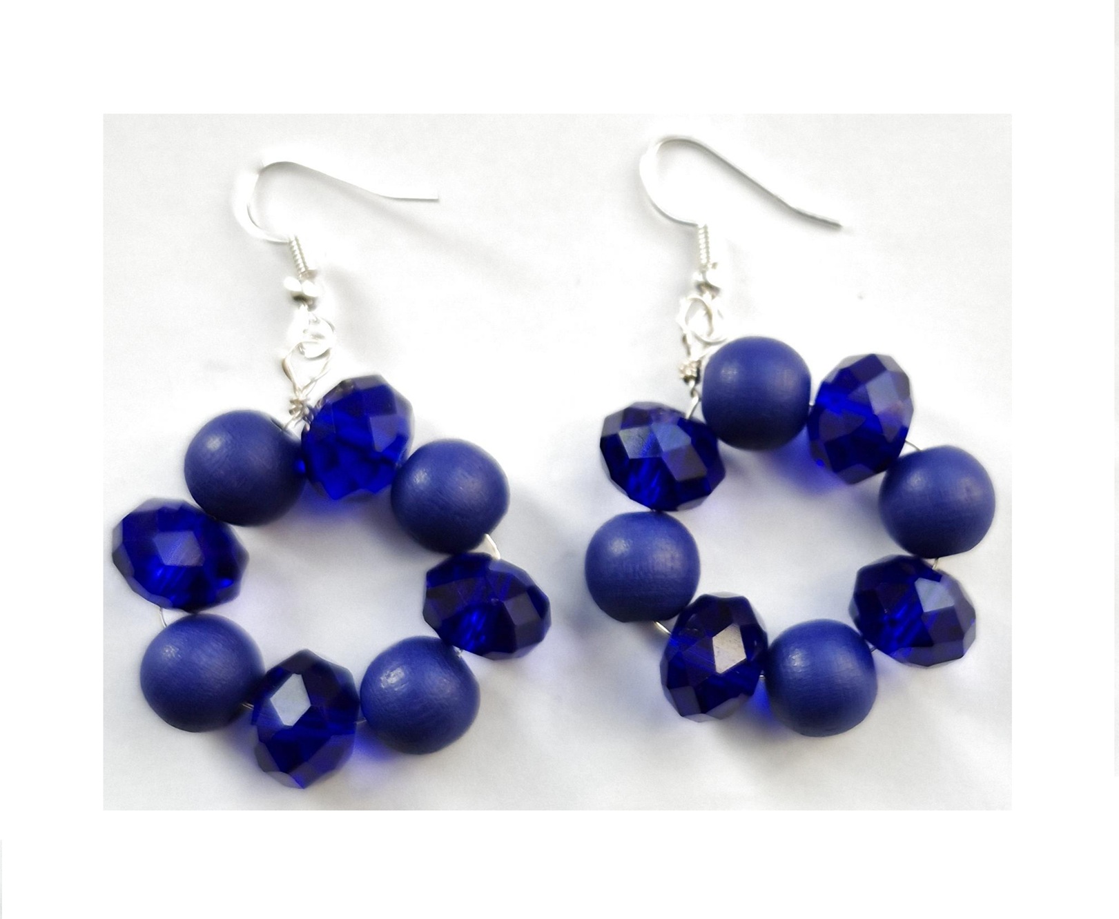 Royal Blue Circular Beaded earrings with silver plated wiring.