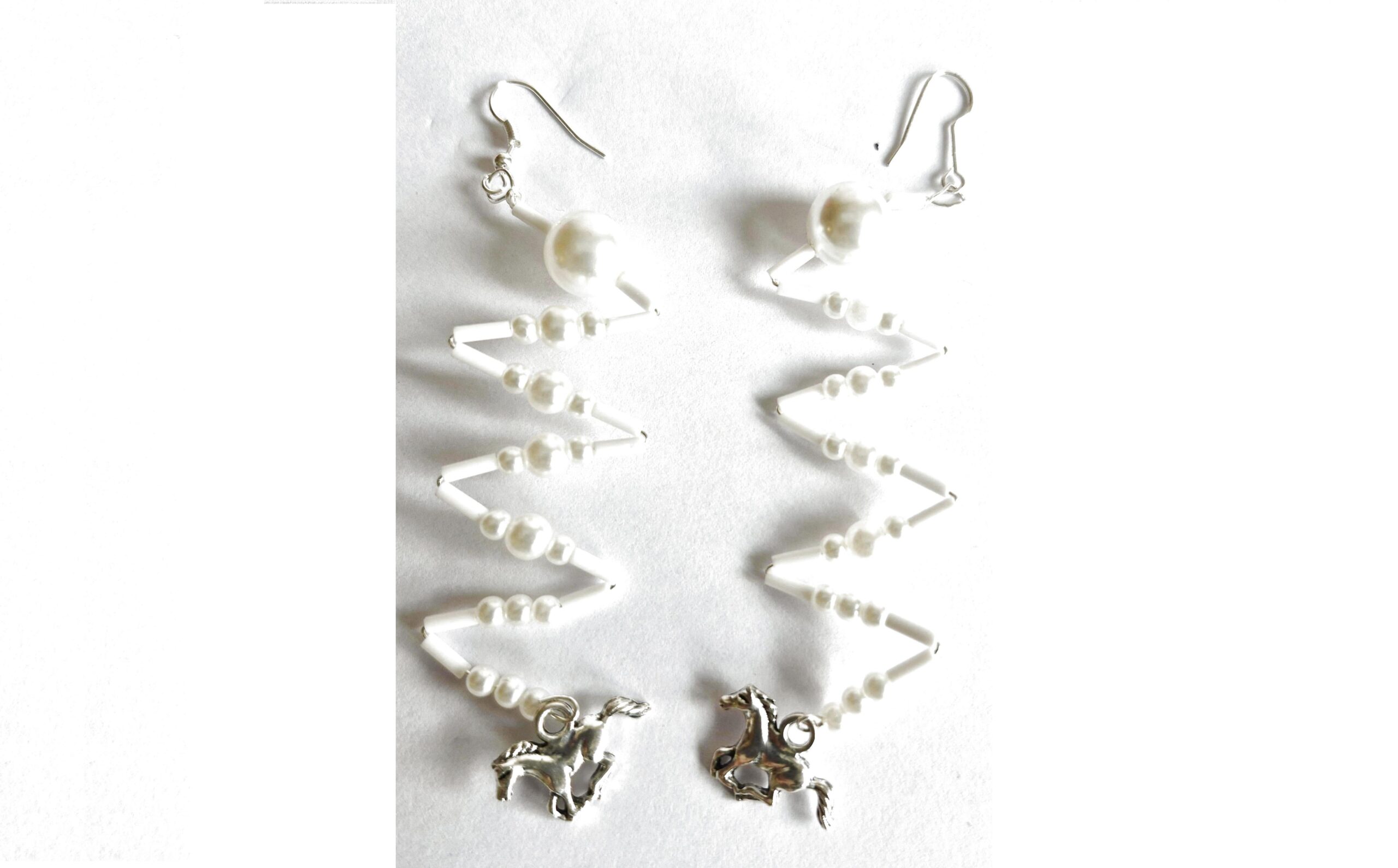 White Zigzag Earrings with a horse at the base. For Hose Lovers everywhere. Made with glass pearls and silver plated metal.