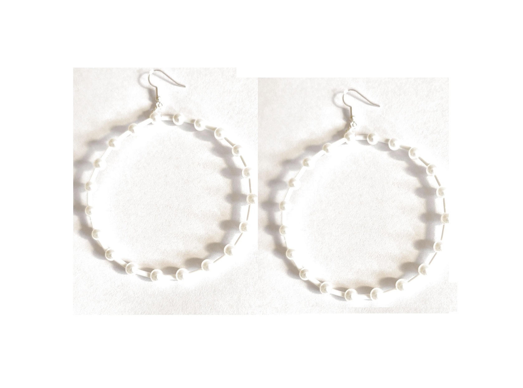 Large white earrings, made from glass pearls. Wear with white or light coloured clothing, or contrast with a black outfit.